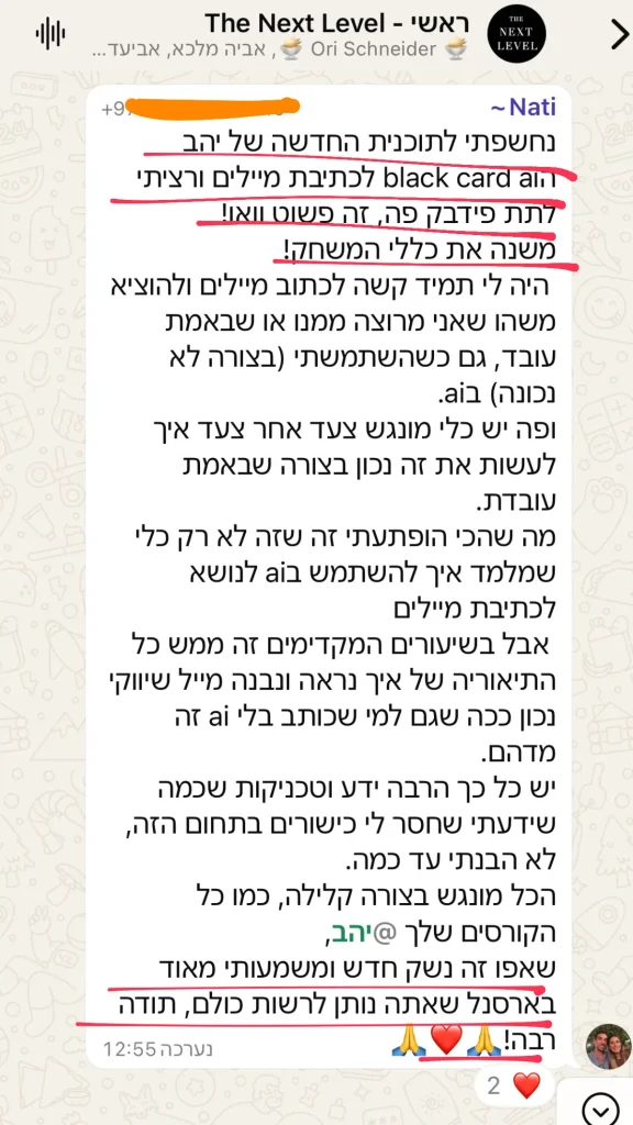 אם אתה יודע לשלוח וואטסאפ – אתה תדע להפעיל את הבלאק קארד. בניתי את המערכת במיוחד לאנשים שלא אוהבים טכנולוגיה. אין קוד, אין התקנות מסובכות. פשוט נכנסים למערכת, בוחרים מייל, עונים על כמה שאלות פשוטות, והמערכת יוצרת לך מייל מושלם תוך 5 דקות. זה פשוט כמו למלא טופס קצר.