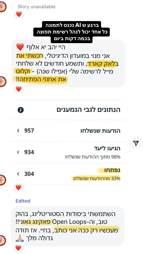 לדחוף לא עובד… זה למה כל המיילים שאני שולח, משלבים סטוריטלינג, ערך כבד ואנלוגיות שמרתקים את הקוראים וגורמים לעוקבים להעריך, לכבד ולסלוק ממך כל דבר שאתה מציע.